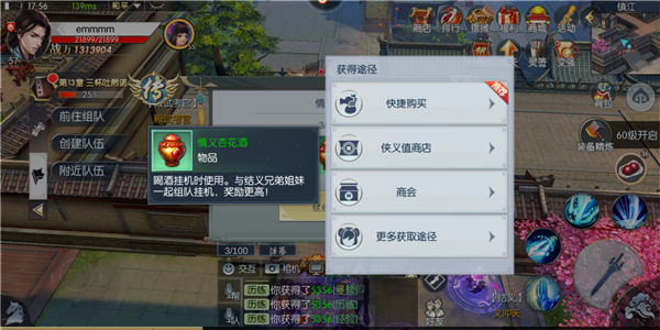 喝酒挂机是使用,是前期升级获取经验的重要来源,其提供的经验随着等级增长。与结义成员一起组队喝酒经验更高。每天可以通过商会购买5瓶,侠义商店购买1瓶。