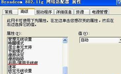 在这里可以看到无线网卡的各个设置,常见的是“启用/禁用无线电”选择了“禁用”和“有线连接可用时禁用”选择了“启用”。
