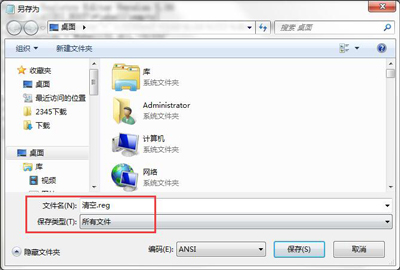 3、在窗口中,命名文件名以.reg结尾,将保存类型改为所以文件,点击确定即可,如图所示: