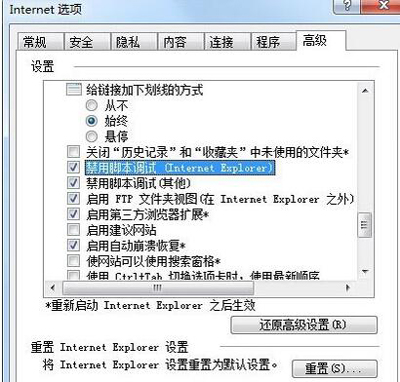 4、最后重新切换到“高级”选项中将“禁用脚本调试(Internet Explorer)”和“禁用脚本调试(其他)”选项打上勾选,点击应用。