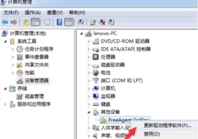 2,待打开“计算机管理”界面后,展开“设备管理器”选项,在右侧找到“其它设备”并右击,从其右键菜单中选择“更新驱动程序”项。