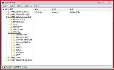2、在打开的注册表编辑器中找到:HKEY_LOCAL_MACHINE ,并展开:HKEY_LOCAL_MACHINE ,在HKEY_LOCAL_MACHINE 展开项中找到:SYSTEM ,也展开:SYSTEM;如图所示:
