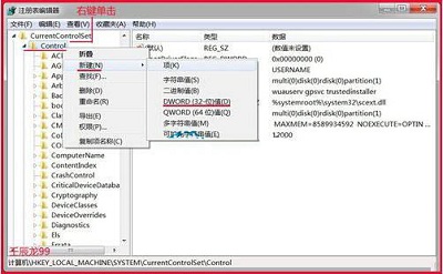 4、在Control的展开项中找到: RegistrySizeLimit,如果没有RegistrySizeLimit这个项,则右键单击:Control,在下拉菜单中左键点击:新建 - DWORD(32-位)值(D);如图所示: