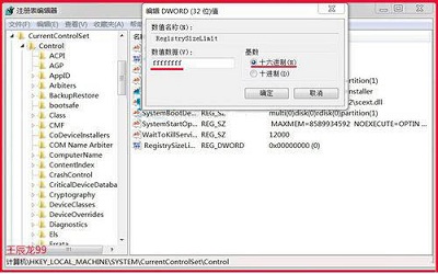 6、左键双击:RegistrySizeLimit,在弹出的编辑 DWORD(32位)值窗口,基数为:十六进制(H)时,在数值数据(V)栏中输入 :ffffffff;如图所示: