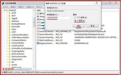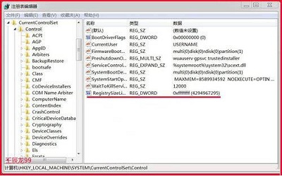 8、回到注册表编辑器,我们可以看到RegistrySizeLimit的DWORD(32-位)值为:0xffffffff(4294967295),退出注册表编辑器,重新启动计算机;如图所示: