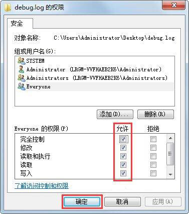 4、然后在Everyone下面勾选所有的【允许】点击确定就可以了!如图所示: