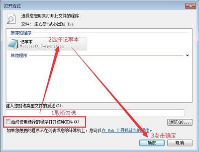 3、在打开方式提示框,取消“始终使用选择的程序打开这种文件”的勾选,然后选择记事本,最后点击“确定”,这样就完美的打开了lrc文件。如图所示: