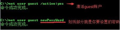 6、输入net user guest /active:yes激活guest账户,改密码的话就是net user guest 新密码。如图所示: