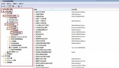 8、依次打开“计算机配置-Windows设置-安全设置-本地策略-用户权限分配”把窗体打开到如下图所示状态。如图所示: