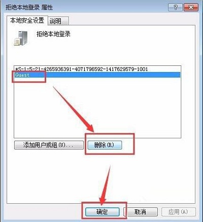 9、分别找到这几项“拒绝本地登录”和“允许本地登录”,把拒绝的guest项删除,如图所示: