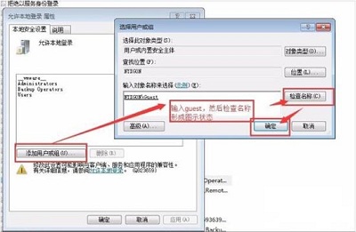 10、找到允许本地登录,把guest添加进去,要注意,是可以手动输入guest,但是一定要点一下“检查名称”,形成完整的名称才行。如图所示: