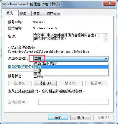 6、将其设为已禁用。这样下次开机后,这个Windows Search服务就不会自动启动了。如图所示: