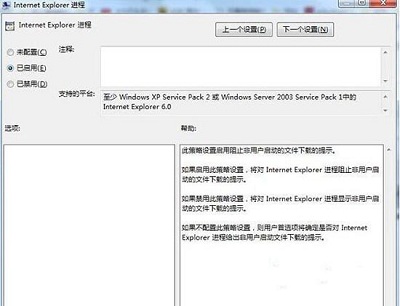 3、右侧页面中双击【Internet Explorer进程】,勾选【已启用】,再选择【确定】。如图所示: