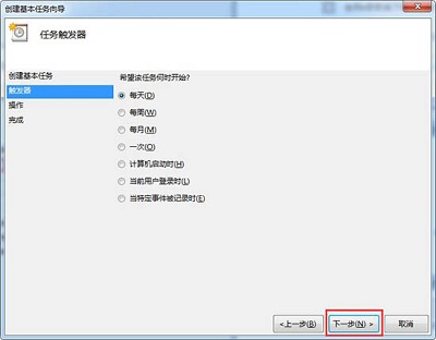 5、在【任务触发器】窗口,鼠标单击选择【每天】或者其他选项,根据自己的需求,然后选择【下一步】;如图所示: