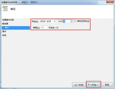 6、在【每日】窗口中,选择指定任务开始日期、时间,和相应的时间间隔,之后选择【下一步】;如图所示: