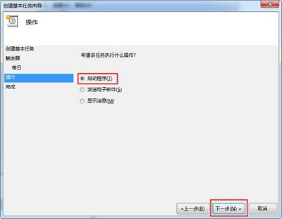 7、在【操作】窗口中,鼠标单击选择【启动程序】项,之后选择【下一步】;如图所示: