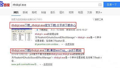 1、打开百度,输入rthdcp.exe,然后下载一个;