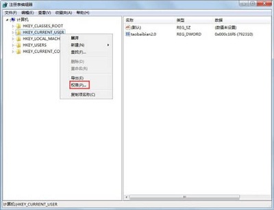 6、右键点击HKEY_CURRENT_USER项,在弹出的菜单中→权限;如图所示: