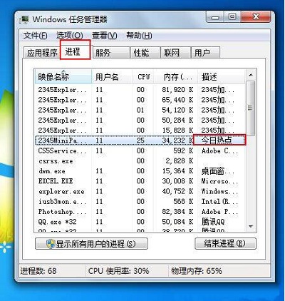 3、选择进程,发现今日热点是2345看图携带的;如图所示: