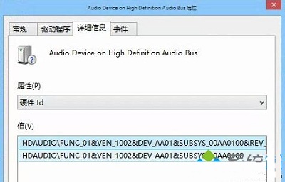 2、若驱动显示不正常,那么接下来需要安装驱动程序,Audio Device on High Definition Audio Bus,这个驱动可以看硬件ID,确认需要安装哪个厂商的设备驱动,比如第一个设备上点击鼠标右键选择属性,之后点击详细信息,选择硬件ID,查看为: