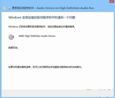 3、但是在安装AMD高清晰音频驱动时出错,提示数据无效,如图:
