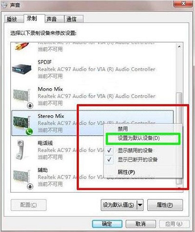 5、此时stereo mix选项已经成为默认设备,已经可以使用了。如图所示: