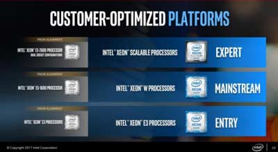 如下图所示,在英特尔修改了Xeon系列的命名规则后,Xeon E3仍是入门工作站级别,Xeon W定位中端;7月发布的Xeon Salable Platform(Purley)处理器,面向的则是是双CPU插槽的高端工作站,继承的是E5-2600系列。