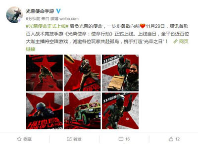此前腾讯才正式宣布旗下首款吃鸡手游《光荣使命:使命行动》开始进行测试,这才没过多久,近日,腾讯又正式宣布将于11月29日正式上线《光荣使命:使命行动》。