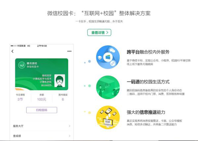 在先期运行的半年多时间内,已有300多所高校申请微信校园卡服务,其中超过100所高校已正式建卡,包括北京大学、武汉学院、深圳大学城、呼伦贝尔学院等。
