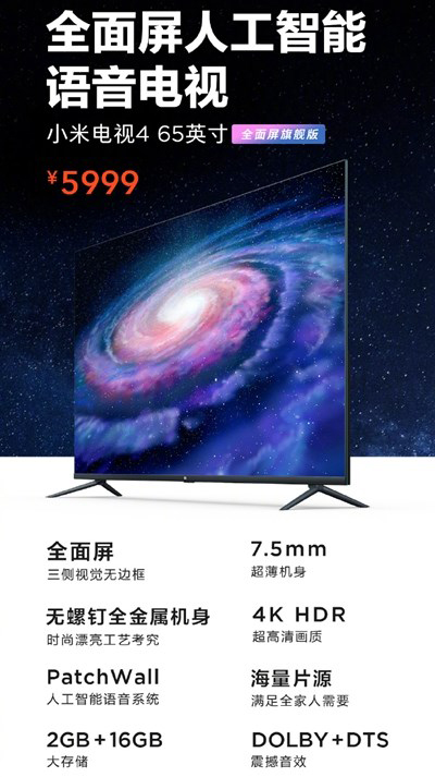 小米正式发布小米电视4 65英寸版本,官方称其为全面屏人工智能语音电视,售价为5999元。