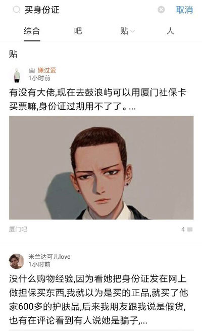 据报道,在“三和大神吧”、“龙华三和吧”、“贵阳吧”等贴吧,均有收售身份证的帖子出现,用户或者“商家”留下收/售信息,便会在帖子下得到回复,甚至有“商家”以自问自答的形式发帖出售身份证。