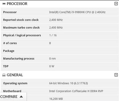 此次现身的是i9-9980HK,它的跑分数据在3DMark上遭到曝光。APISAK晒出的截图显示,i9-9980HK支持解锁倍频器,具有8核心、16线程,工作频率为2.4 GHz。这颗CPU其他参数没有列出,但是从其“H”系列的定位来推测,TDP应该在45W。