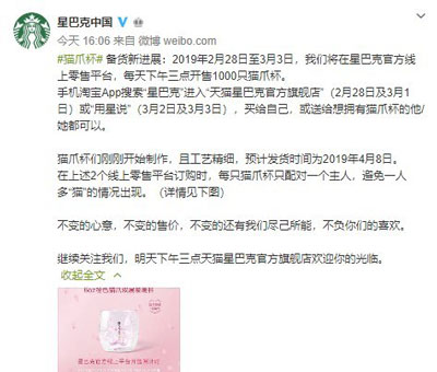 星巴克官方宣布,2019年2月28日至3月3日,将在星巴克官方线上零售平台,每天下午三点开售1000只猫爪杯。手机淘宝App搜索“星巴克”进入“天猫星巴克官方旗舰店”(2月28日及3月1日)或“用星说”(3月2日及3月3日),都可以购买到这款杯子。