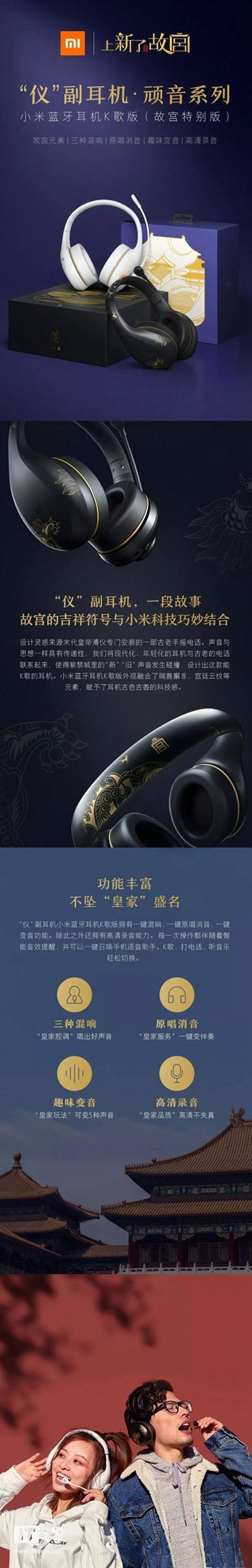 一个月前,小米发布了一款蓝牙K歌耳机(故宫特别版),定价为399元,外形方面两者差不多,都是头戴包耳式设计,不过视频中新款没有故宫版的图案,定价上应该比故宫版低一些。