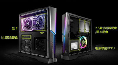 海皇戟X的机身很窄,因此显卡采用了竖置的安装方式。显卡和M.2固态置于一侧,另一侧还有2.5英寸硬盘位以及电源内存和CPU等关键部件。机身的正面和侧面还有RGB灯光,可以通过软件进行同步。
