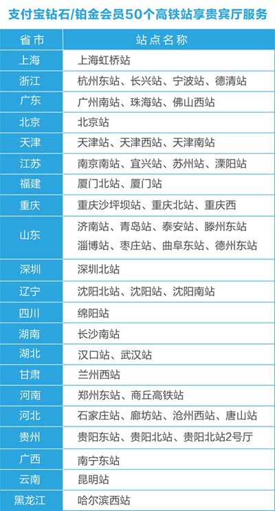 现在,支付宝钻石和铂金会员可免费享受全国50个高铁站VIP服务,包括专属休息室、免费茶点饮料、Wi-Fi、手机充电、上车提醒等,再也不用在人满为患的候车大厅挤来挤去,更贴心的是,还可以带1.2米以下的儿童同行。