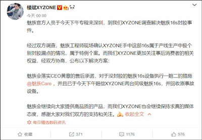 从深圳市爱思维颂网络科技有限公司创始人楼斌公布的调查结果来看,魅族工程师现场确认XYZONE手中这部16s属于产线生产中极个别封胶漏点的情况,属于特例个案。