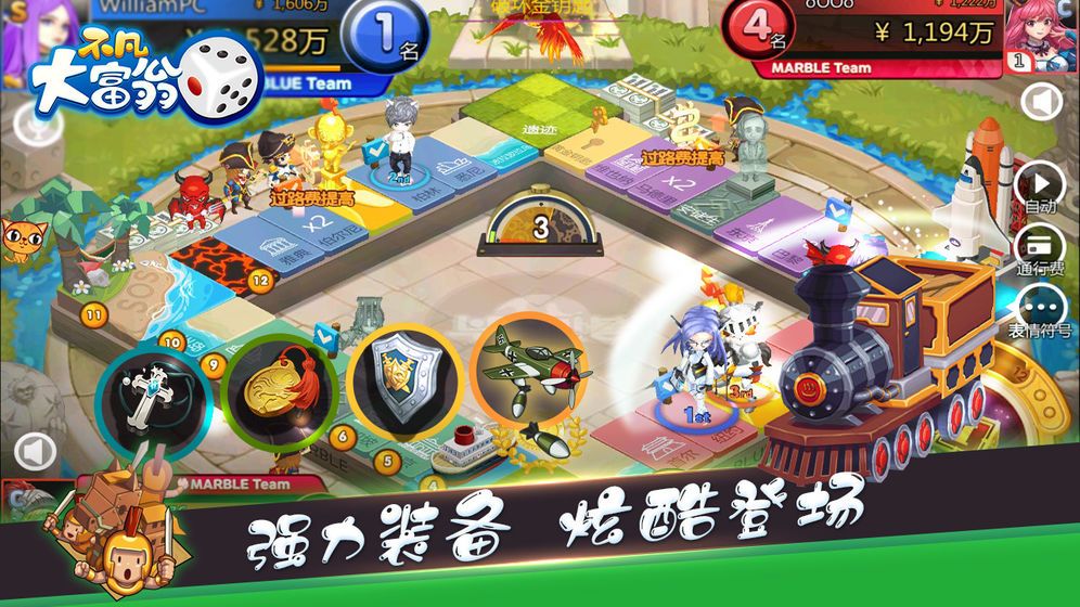 1、Q版卡通风格的游戏画风,感受非常有趣的大富翁竞技乐趣;