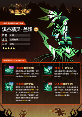 诞生在溪谷平原的盖娅,性格火爆的她因行动轻盈优美,深受周围誓灵们喜爱,被称为溪谷精灵。后来在瞬的指点下,盖娅在“战神之巅”比赛中运用绝技“一箭穿心”打败上万名异族誓灵,成为誓灵大陆的新游侠强者。