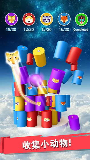 看准圆筒的颜色,用相同颜色的球球去撞击,就能够完成消除。从下方攻击,能够造成圆筒大面积倒塌哦!