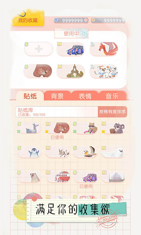 除了超多贴纸可以收集,还有不同背景、头像、边框、音乐和表情任君选择!